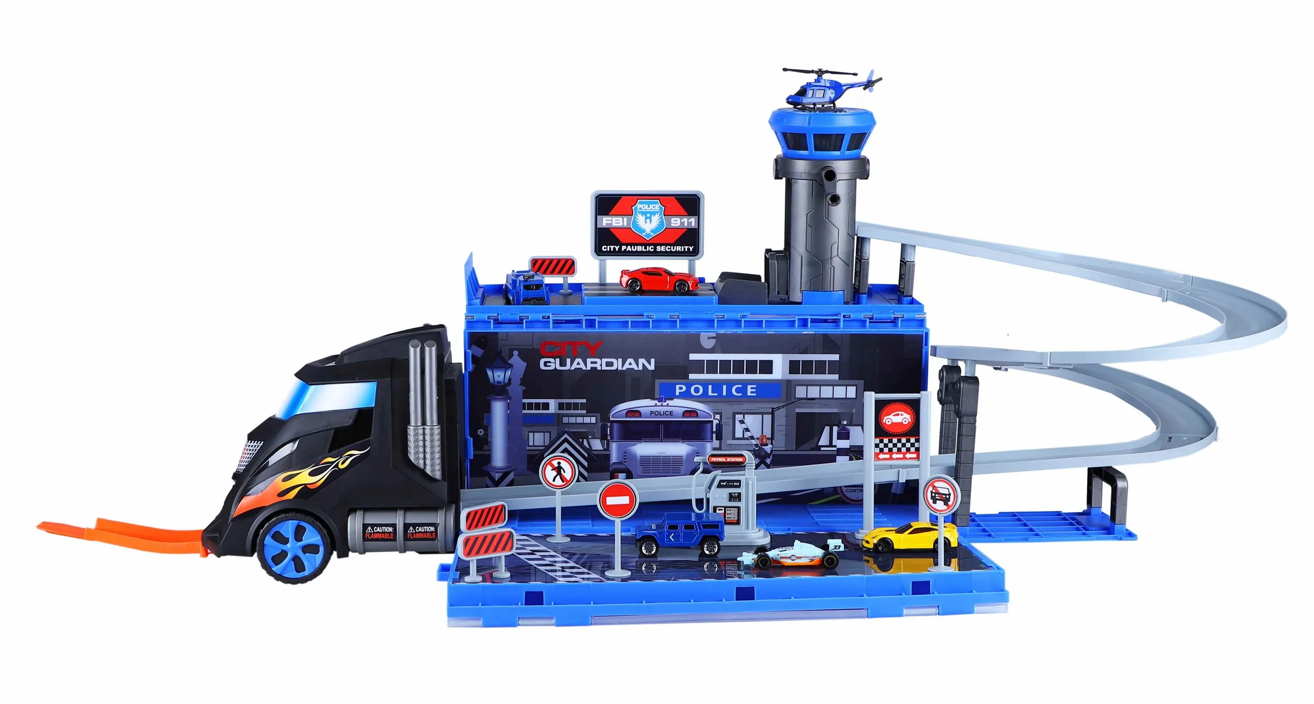 Playset Parking Φορτηγό Track Police Άνοιξε το απο το πλάι και στήσε την δική σου πίστα αγώνων! Περιλαμβάνει αυτοκινητάκια, ράγες πίστας, σήματα κυκλοφορίας, ελικοδρόμιο!