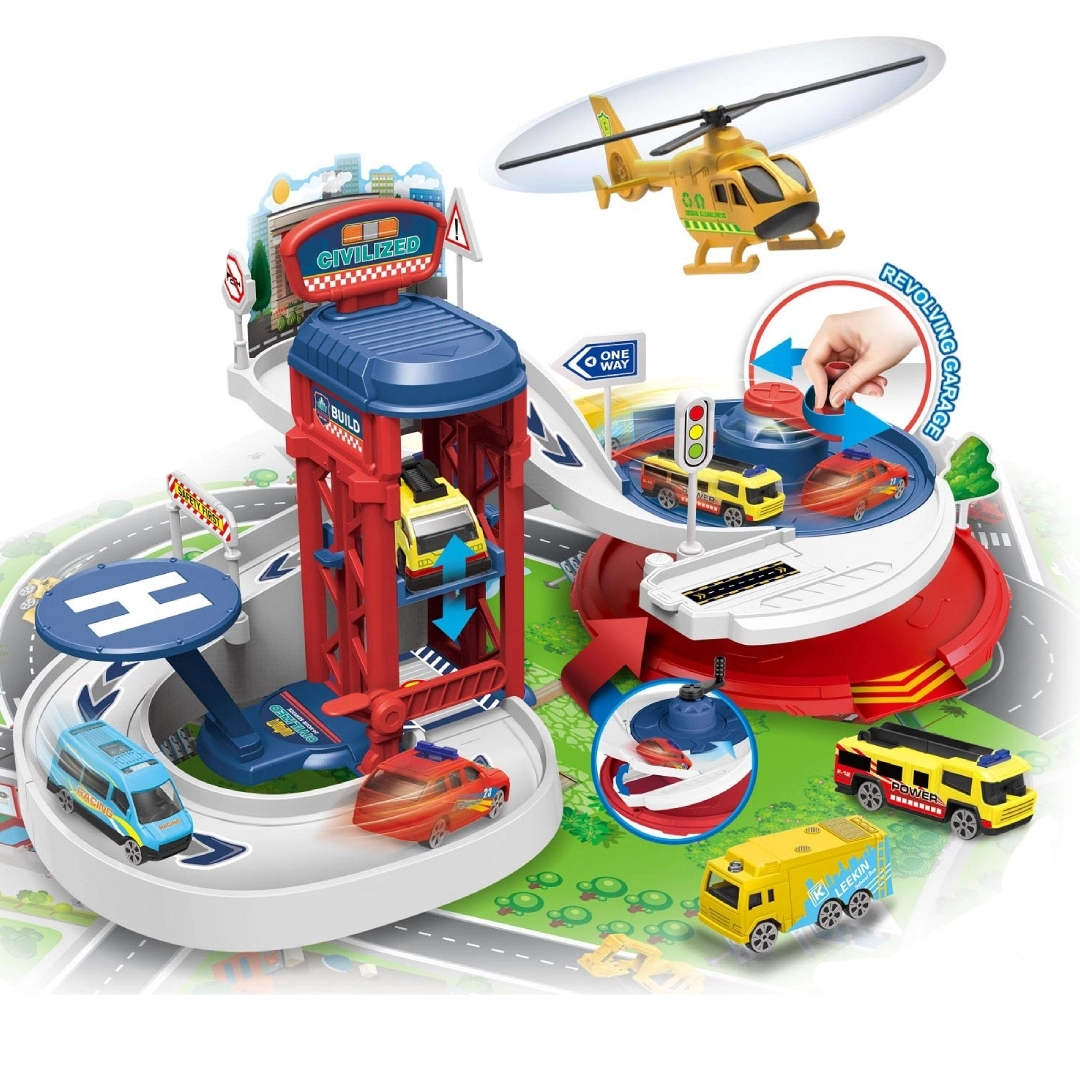 Playset Parking Γκαραζ Πόλη Περιλαμβάνει 33 αξεσουάρ και ένα “χαλί” σκηνικό πόλης Οδήγησε τα οχήματα μέσα στην πόλη και γκαράζ Ανέβασε τα με τον ανελκυστήρα και δες τα να κατεβαίνουν με ταχύτητα! Προσγειώσε το ελικόπτερο στο ελικοδρόμιο και άλλαξε την κατεύθυνση του γκαράζ με τον περιστρεφόμενο μοχλό