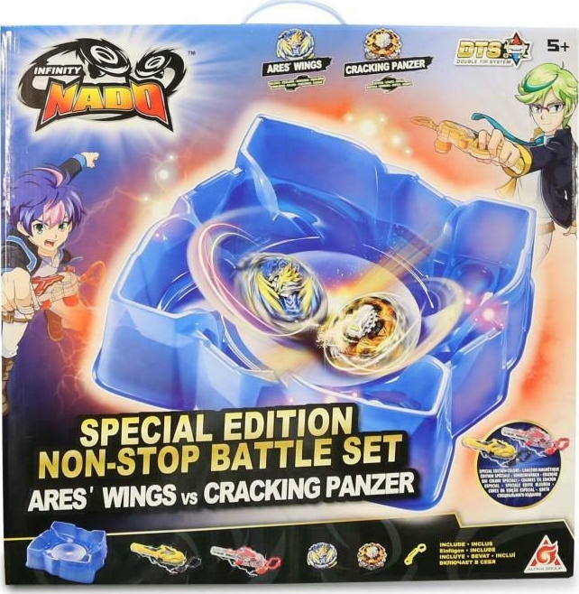 Infinity Nado V – Battle Edition Arena Αντιμετωπίστε τους φίλους σας σε άγριες κορυφαίες μάχες με αυτό το σετ spinner Infinity Nado V. Θα έχετε όλα όσα χρειάζεστε για να ξεκινήσετε να γυρίζετε τις σβούρες μάχες
