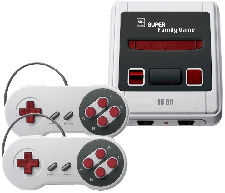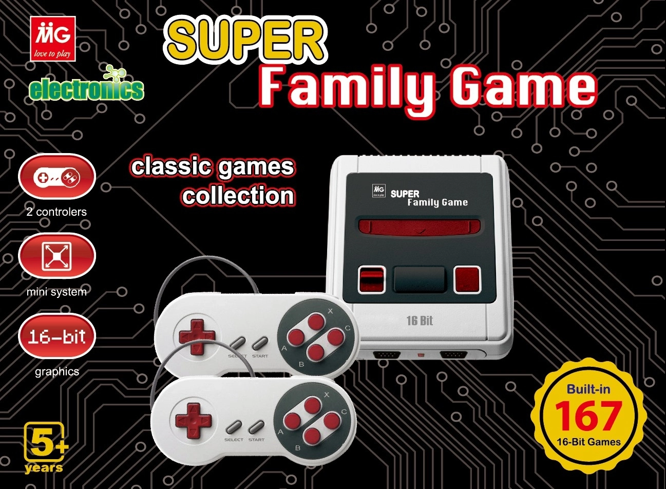 Κονσόλα Παιχνιδιών Τηλεόρασης Mg Super Family Game 16 Bit 167 Games Κονσόλα 16-bit με 2 χειριστήρια. Με 167 παιχνίδια στη μνήμη. Μικρό βολικό μέγεθος συσκευής. Ανθεκτική ποιότητα κατασκευής. Περιλαμβάνεται: • κονσόλα • 2 χειριστήρια • καλώδιο AV- για σύνδεση με την τηλεόραση • μετασχηματιστής